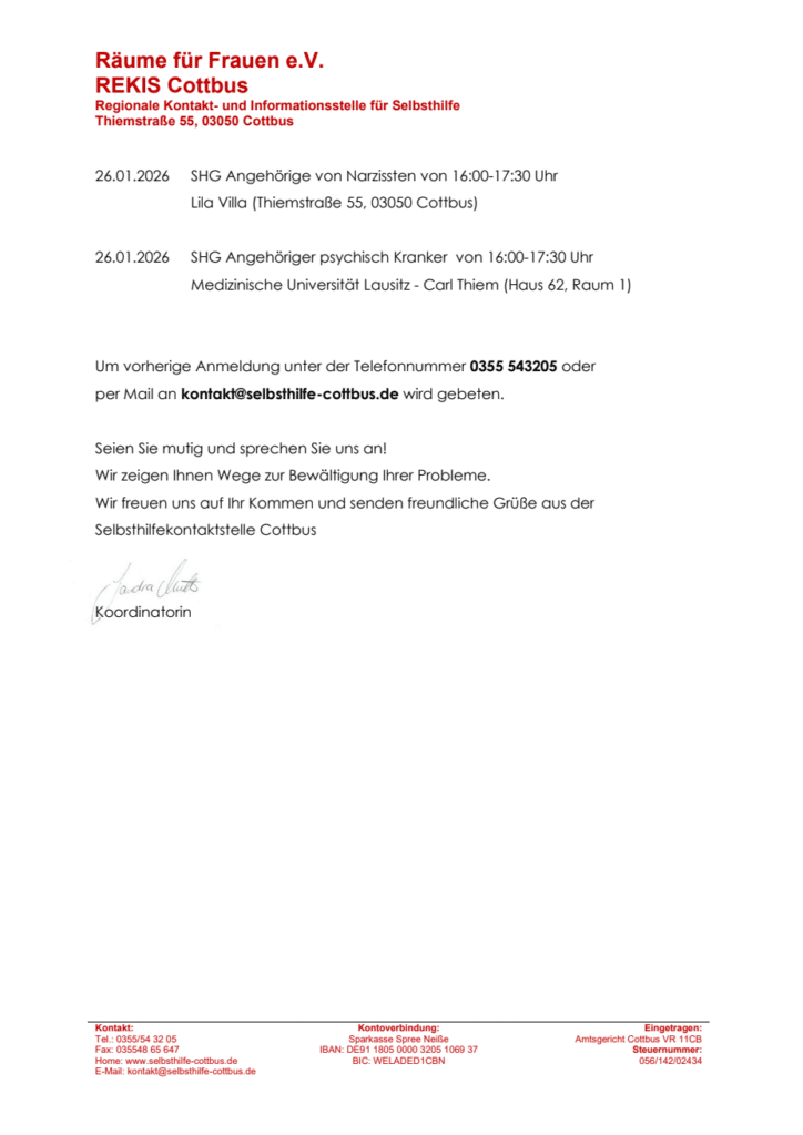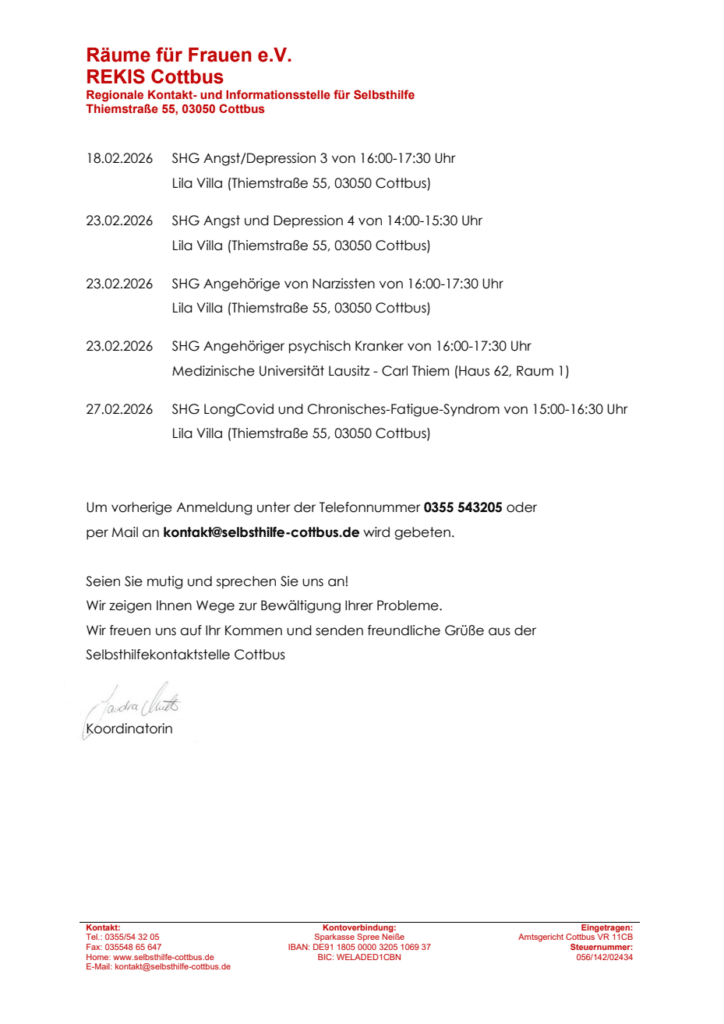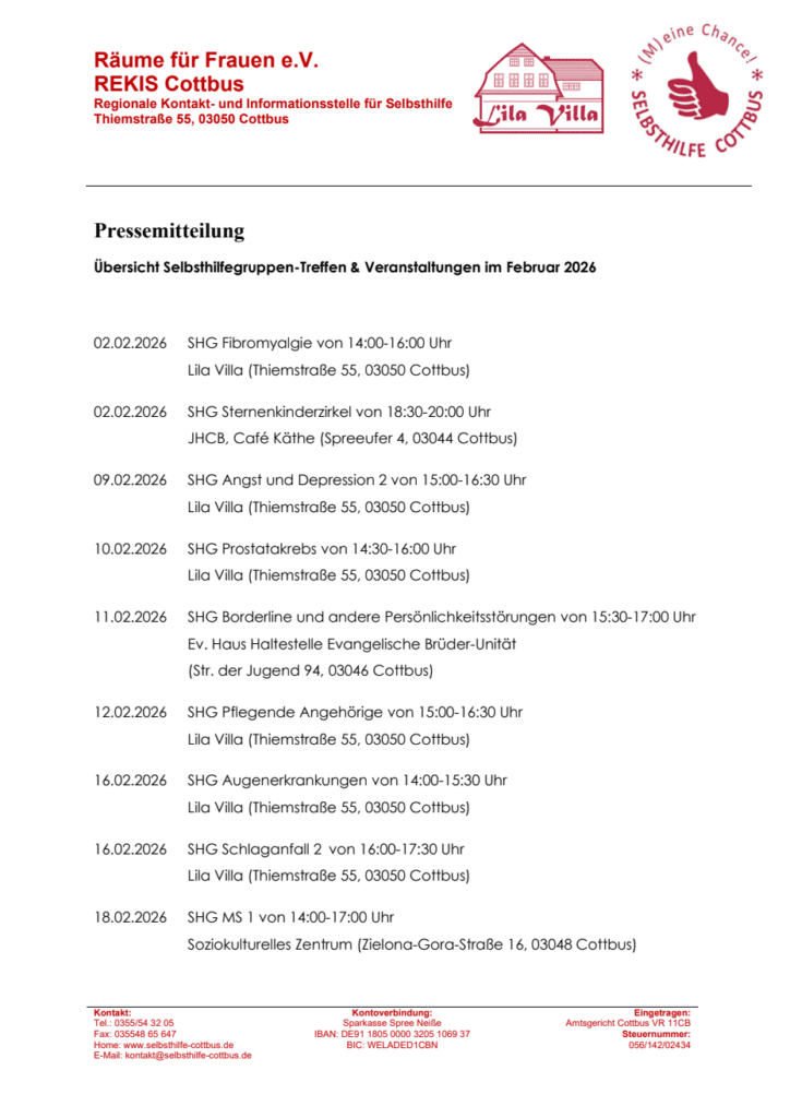Wollen Sie auch einmal eine Selbsthilfegruppe in Cottbus ausprobieren? Oder wollen Sie wissen, wann sich eine Gruppe das nächste Mal trifft? Hier finden Sie alle Termine der Selbsthilfegruppen für Januar und Februar 2026.